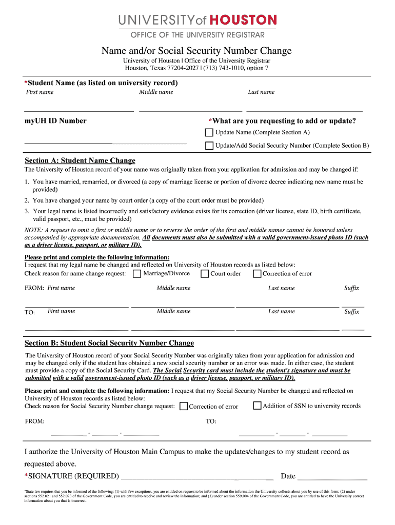 Name and/or Social Security Number Change University of Houston Office of the University Registrar Houston, Texas 772042027 (713) 7431010, option 7×Student Name (as listed on university record) First