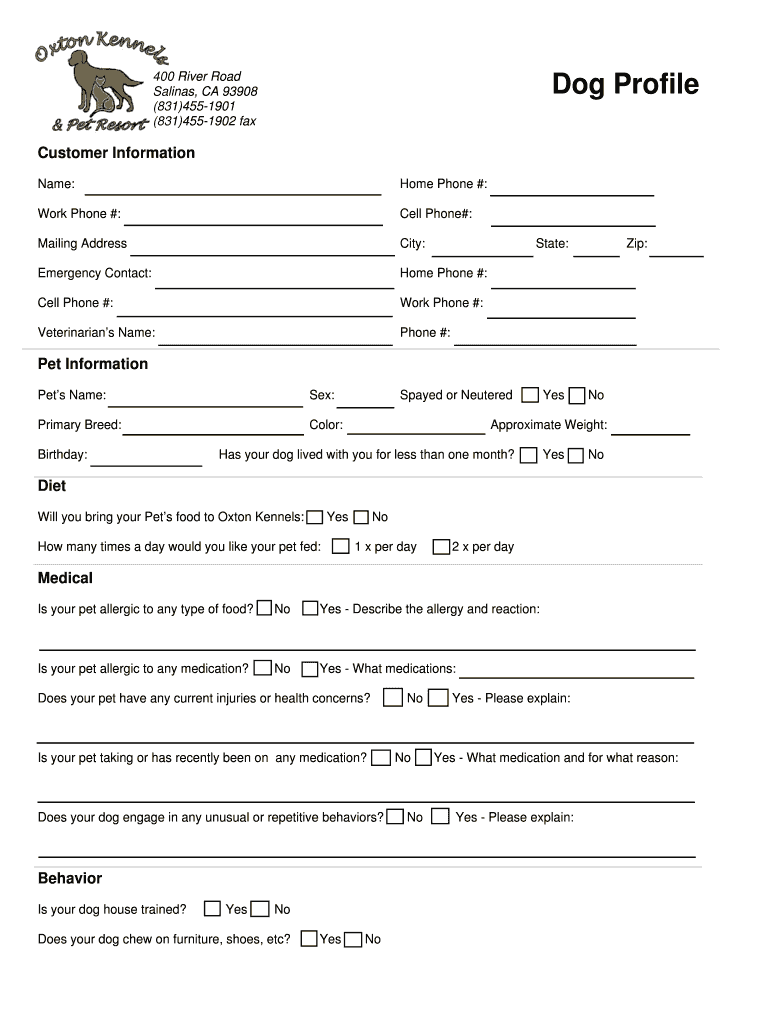 All boarding includes yappy can be filled out online or in paper format, providing information about the pets, their owners, and the duration of the boarding.