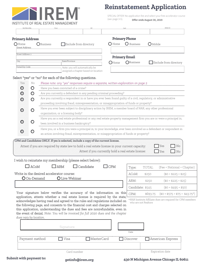 Reinstatement Application SPECIAL OFFER! No application fee and select your free accelerator course (see page 35). Offer ends August 30, 2019, Mr/Mrs/MsFirstMIPrimary Preprimary Address Home IREM