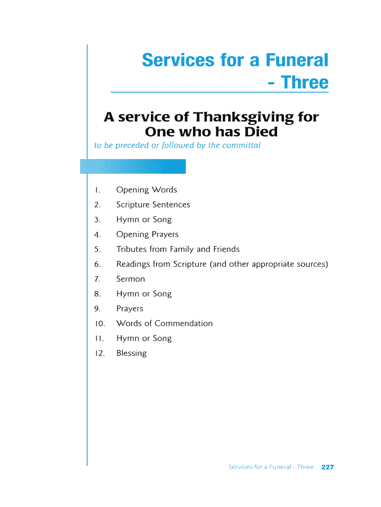 Services for a Funeral Three A service of Thanksgiving for One who has Died to be preceded or followed by the committal1. Opening Words2. Scripture Sentences3. Hymn or Song4. Opening Prayers5. Tributes