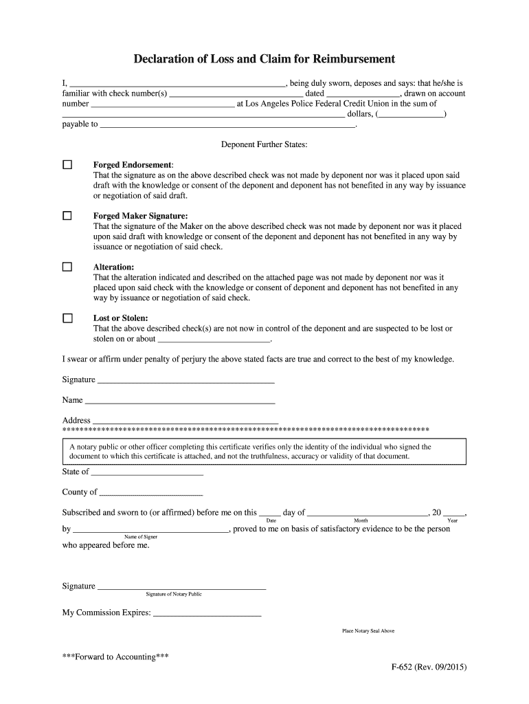 Declaration of Loss and Claim for Reimbursement I, being duly sworn, deposes and says: that he/she is familiar with check number(s) dated, drawn on account number at Los Angeles Police Federal Credit