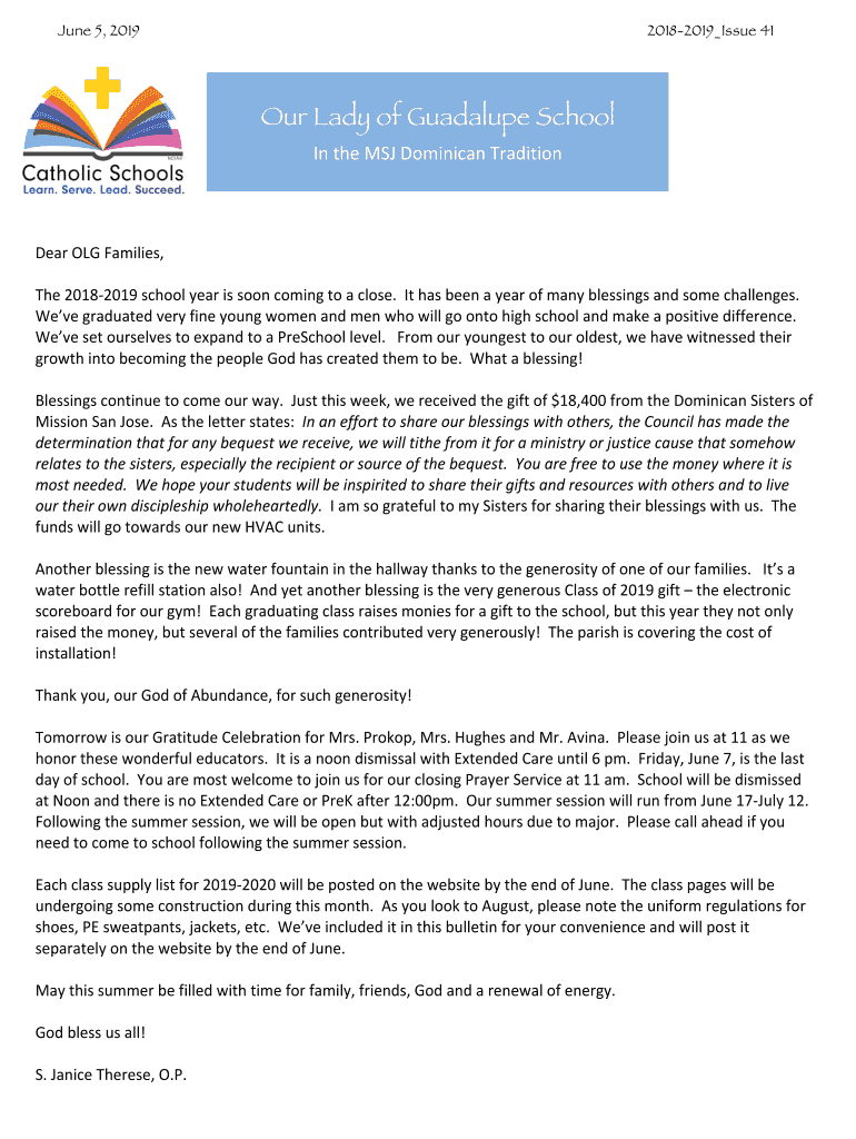 June 5, 201920182019×Issue 41In×the×MSC×Dominican×Tradition Lady of Guadalupe Schoolmate×OLD×Families, The 20182019 school×year×is soon×coming×to a close. It×has×been×a year×of many×blessings×and×some×challenges.
