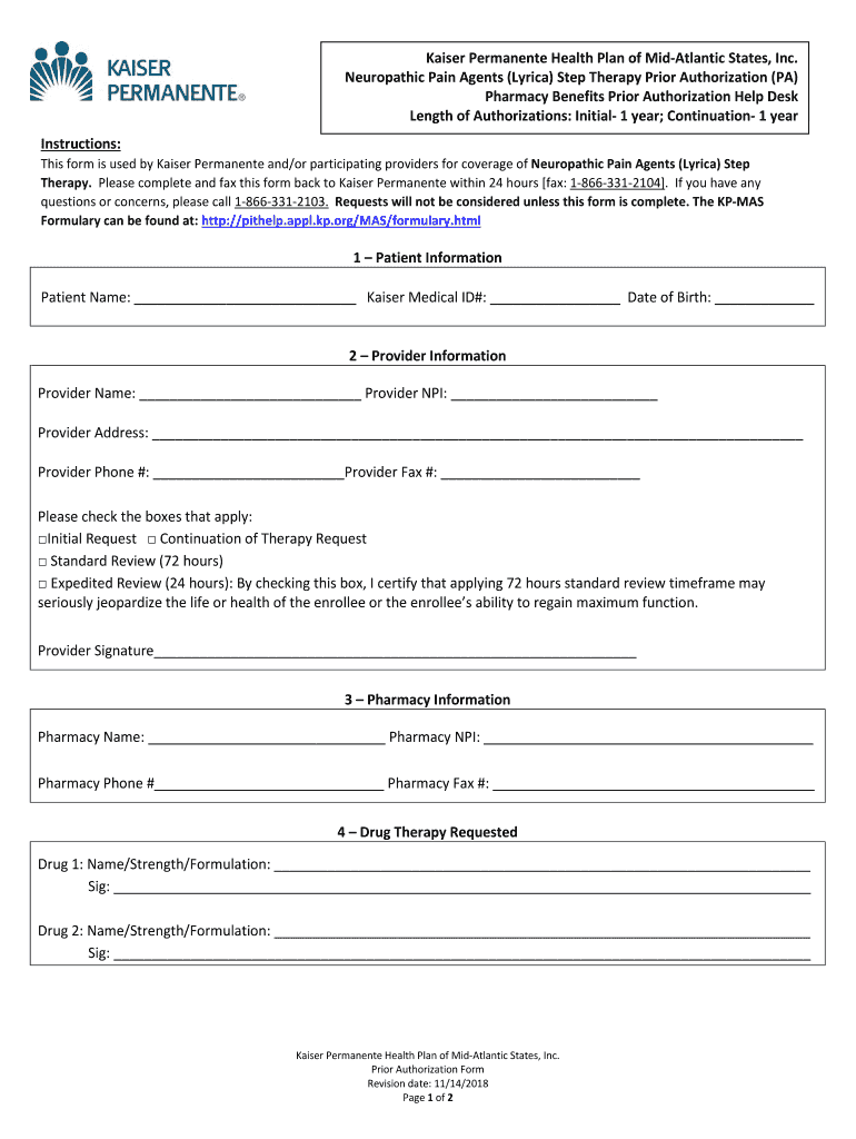 Kaiser Permanent Health Plan of mid-Atlantic States, Inc. Neuropathic Pain Click Agents or tap () Easter to enter Therapy text. Prior to Prior Authorization (PA) Pharmacy Benefits Prior Authorization