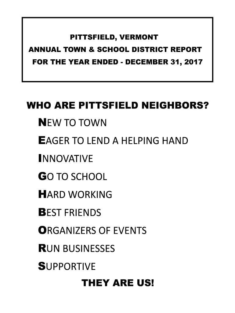 PITTSFIELD, VERMONT ANNUAL TOWN & SCHOOL DISTRICT REPORT FOR THE YEAR ENDED DECEMBER 31, 2017WHO ARE PITTSFIELD NEIGHBORS?NEW TO TOWN EAGER TO LEND A HELPING HAND INNOVATIVE GO TO SCHOOL Hardworking