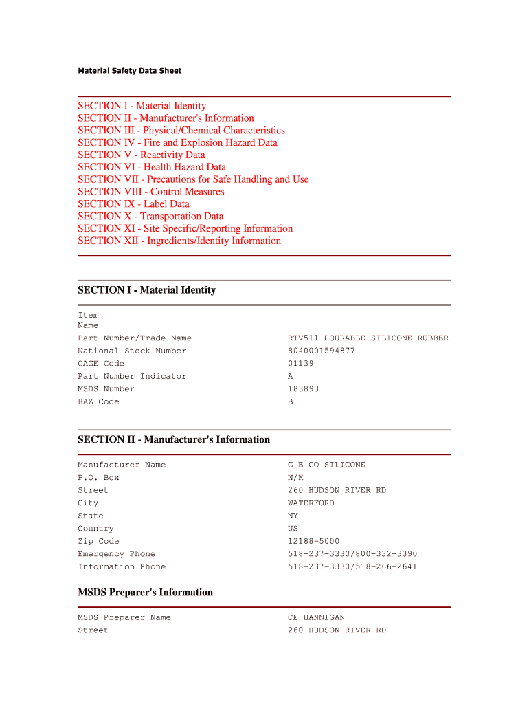 Material Safety Data SheetSECTION I Material Identity SECTION II Manufacturer's Information SECTION III Physical/Chemical Characteristics SECTION IV Fire and Explosion Hazard Data SECTION V Reactivity