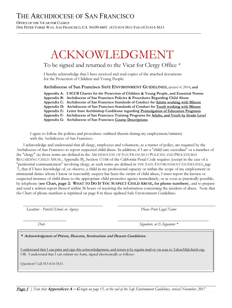 THE ARCHDIOCESE OF SAN FRANCISCO OFFICE OF THE VICAR FOR CLERGY ONE PETER YOKE WAY, SAN FRANCISCO, CA 941096601 (415) 6145611 FAX (415) 6145613 ACKNOWLEDGMENT To be signed and returned to the Vicar