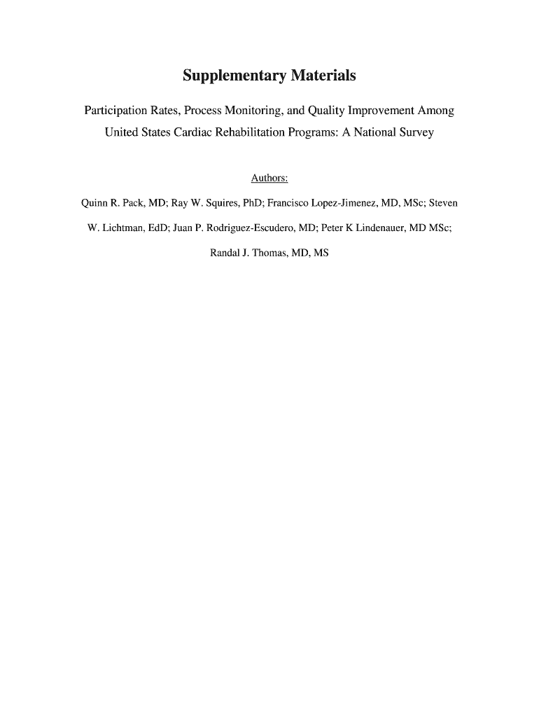 Supplementary Materials Participation Rates, Process Monitoring, and Quality Improvement Among United States Cardiac Rehabilitation Programs: A National SurveyAuthors: Quinn R. Pack, MD; Ray W. Squires,