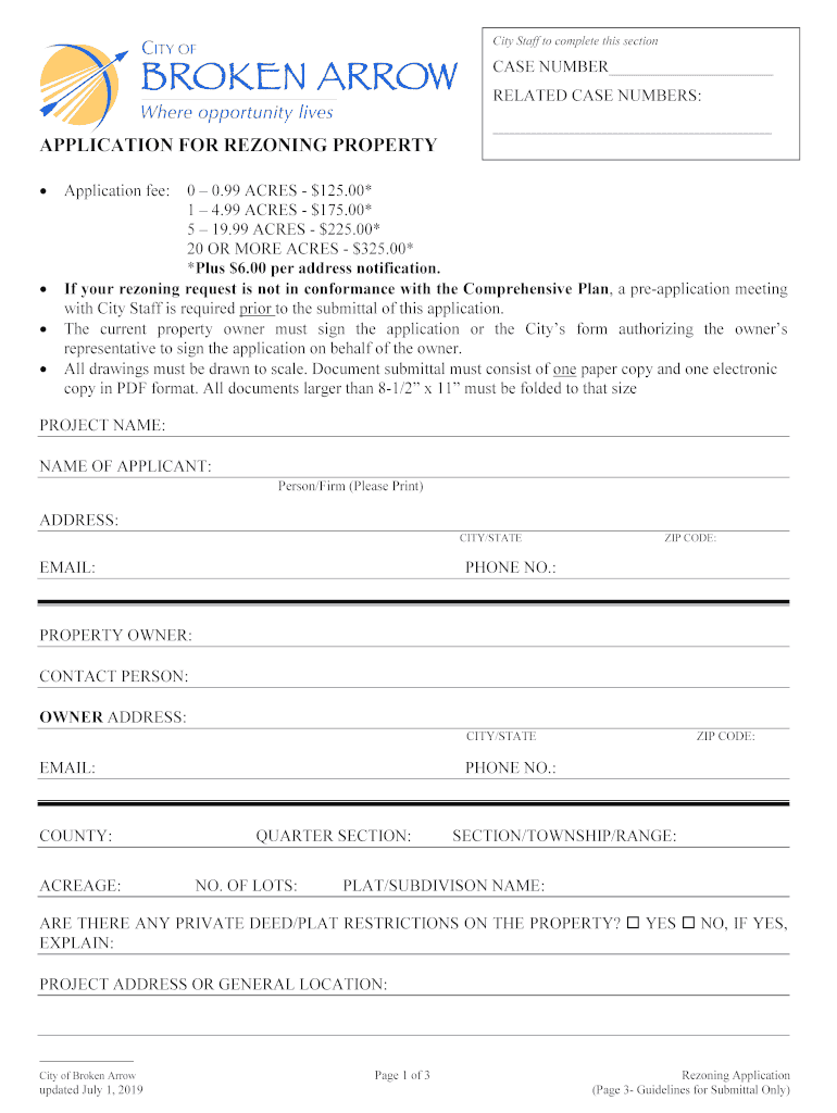 City Staff to complete this section CASE NUMBER RELATED CASE NUMBERS:APPLICATION FOR REZONING PROPERTY Application fee:0 0.99 ACRES $125.00× 1 4.99 ACRES $175.00× 5 19.99 ACRES $225.00× 20 OR MORE