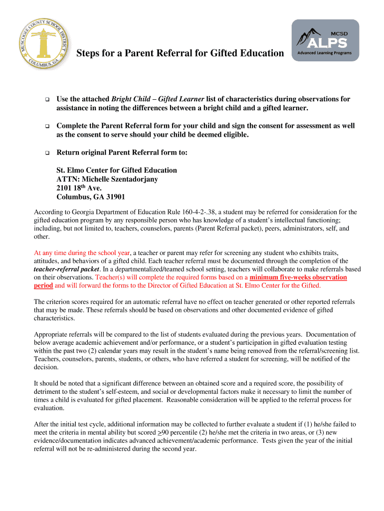 Steps for a Parent Referral for Gifted Educations the attached Bright Child Gifted Learner list of characteristics during observations for assistance in noting the differences between a bright child
