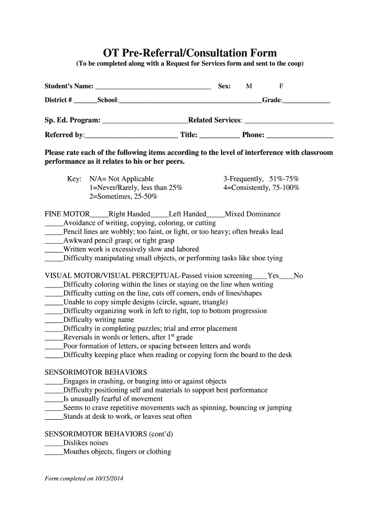 OT Referral/Consultation Form (To be completed along with a Request for Services form and sent to the coop) Students Name: Sex:District # School: Grade: Sp. Ed. Program: Related Services: Referred