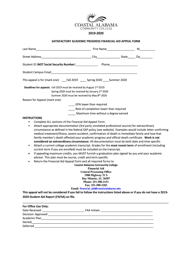 20192020 SATISFACTORY ACADEMIC PROGRESS FINANCIAL AID APPEAL FORM Last Name First Name M Street Address City State Zip Student ID (NOT Social Security Number) Phone Student Campus Email This appeal