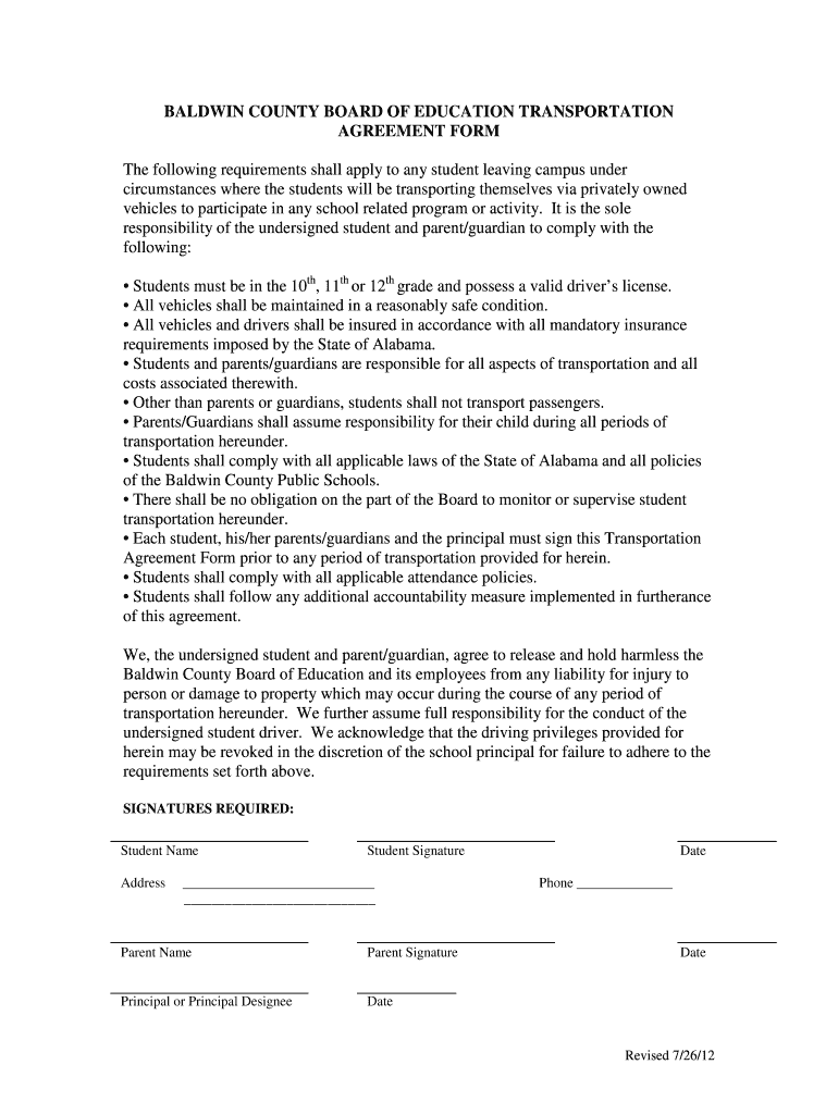 BALDWIN COUNTY BOARD OF EDUCATION TRANSPORTATION AGREEMENT FORM The following requirements shall apply to any student leaving campus under circumstances where the students will be transporting themselves