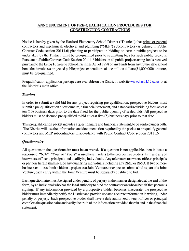Notice is hereby given by the Hanford Elementary School District (District) that prime or general