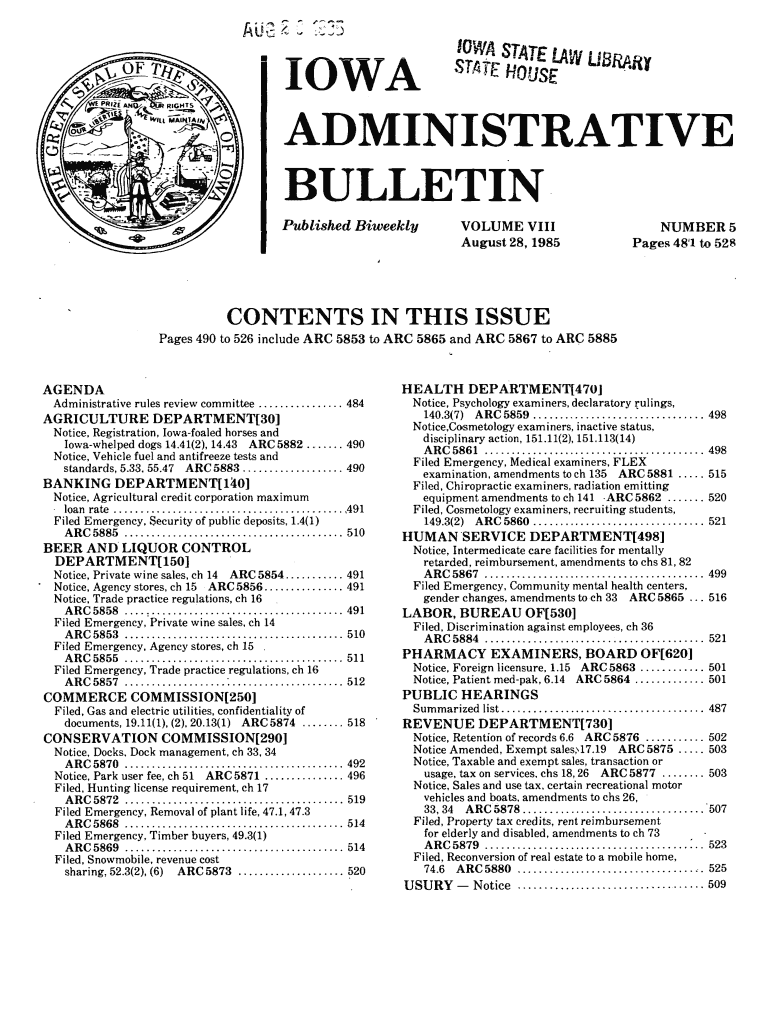 AUG 2 C *35IOWA STATE HOUSE ADMINISTRATIVE BULLETIN Published, BiweeklyVOLUME VIII August 28,1985NUMBER 5 Pages 481 to 528CONTENTS IN THIS ISSUE Pages 490 to 526 include ARC 5853 to ARC 5865 and ARC