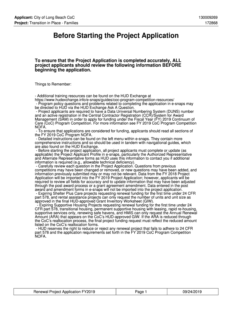 Applicant: City of Long Beach COC Project: Transition in Place Families130009269 172868Before Starting the Project Application ensure that the Project Application is completed accurately, ALL project
