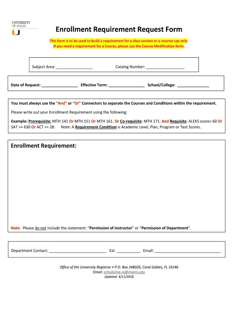 Enrollment Requirement Request Form This form is to be used to build a requirement for a class section or a reserve cap only. If you need a requirement for a Course, please use the Course Modification