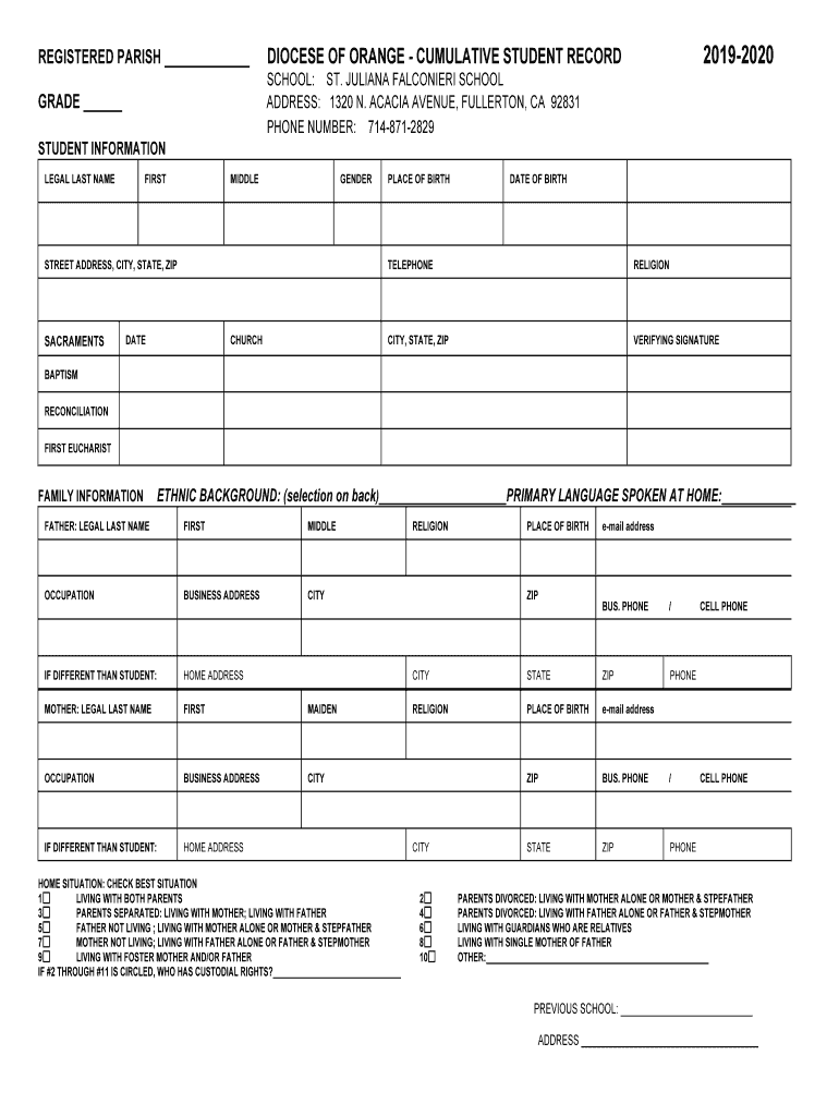 REGISTERED PARISH DIOCESE OF ORANGE CUMULATIVE STUDENT RETROGRADE SCHOOL: ST. JULIANA FALCONER SCHOOL ADDRESS: 1320 N. ACACIA AVENUE, FULLERTON, CA 92831 PHONE NUMBER: 714871282920192020STUDENT INFORMATION