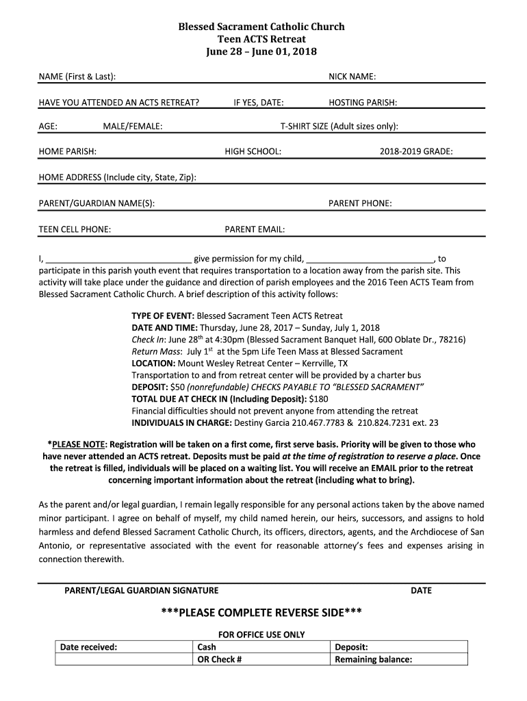 Blessed Sacrament Catholic Church Teen ACTS Retreat June 28 June 01, 2018, NAME (First & Last):NICK NAME:HAVE YOU ATTENDED AN ACTS RETREAT? AGE:MALE/FEMALE:IF YES, DATE:HOSTING PARISH:SHIRT SIZE (Adult