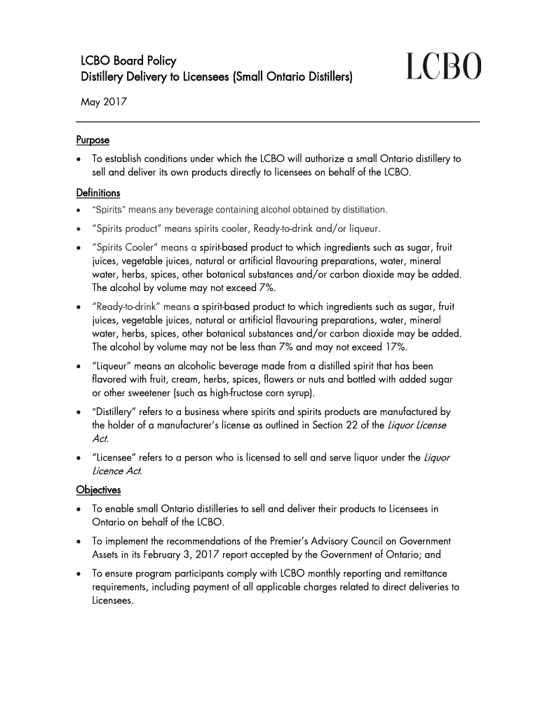 Get the free Direct Delivery to Licensees (Small Ontario Distilleries) Policy