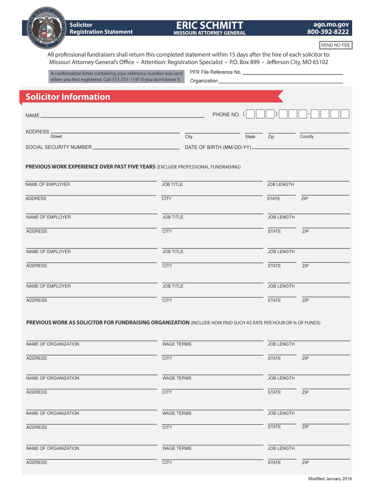 ERIC SCHMITTSolicitor Registration Statement ago.mo.gov 8003928222MISSOURI ATTORNEY GENERALS END NO Fall professional fundraisers shall return this completed statement within 15 days after the hire