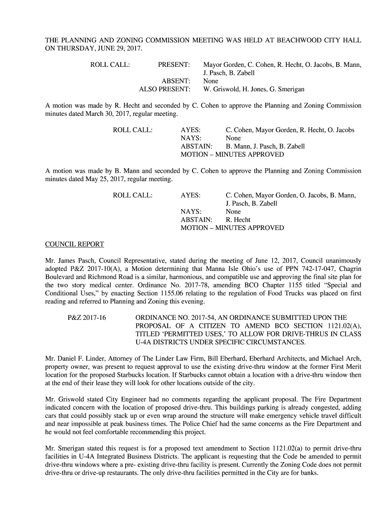 THE PLANNING AND ZONING COMMISSION MEETING WAS HELD AT BEACHWOOD CITY HALL ON THURSDAY, JUNE 29, 2017. ROLL CALL:PRESENT: ABSENT: ALSO PRESENT:Mayor Garden, C. Cohen, R. Heart, O. Jacobs, B. Mann,