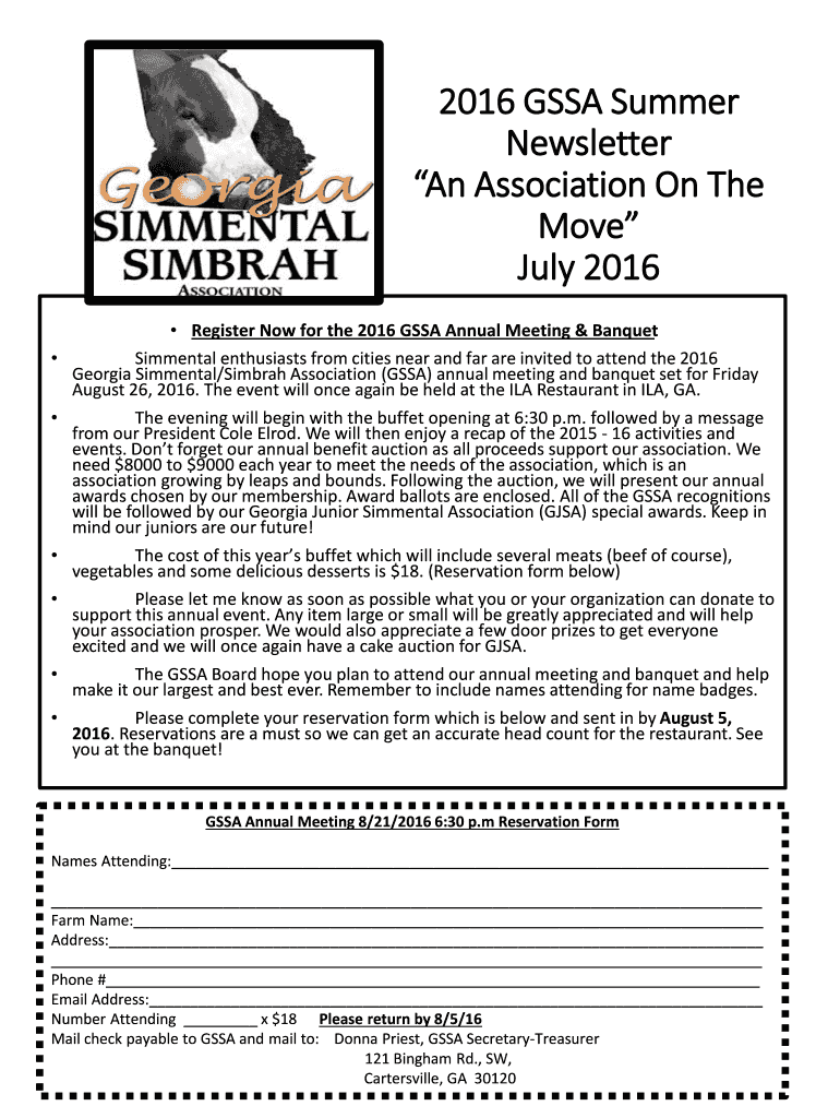 2016 SSA Summer Newsletter An Association On The Move July 2016 Register Now for the 2016 SSA Annual Meeting & Banquet Simmental enthusiasts from cities near and far are invited to attend the 2016
