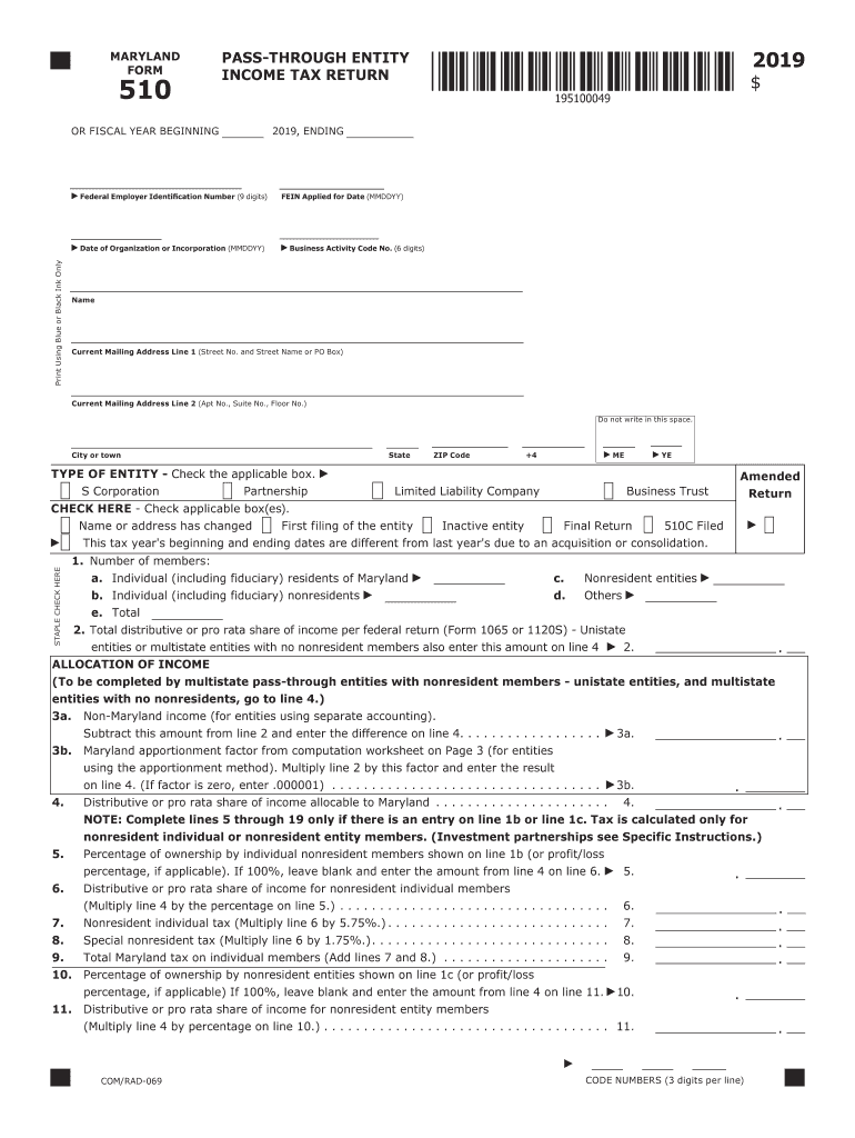 MARYLAND FORM510OR FISCAL YEAR BEGINNING Federal Employer Identification Number (9 digits)Date of Organization or Incorporation (MIDDAY)Print Using Blue or Black Ink Only2019PASSTHROUGH ENTITY INCOME