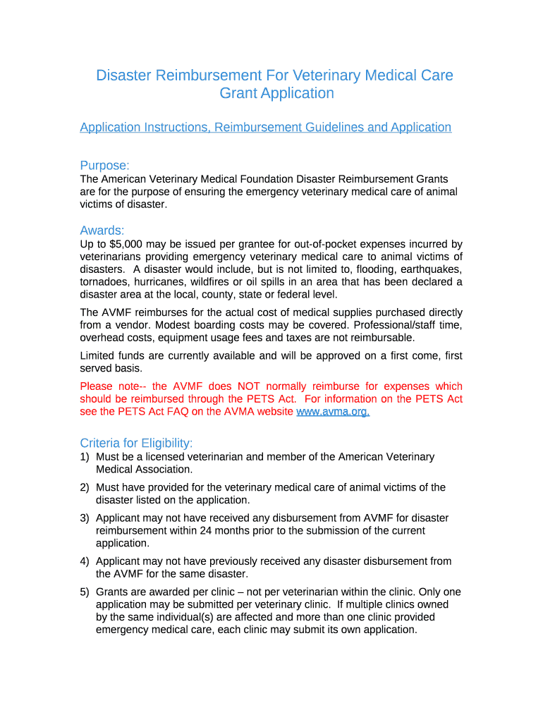 Instructions for the Disaster Reimbursement For Veterinary Medical Care form