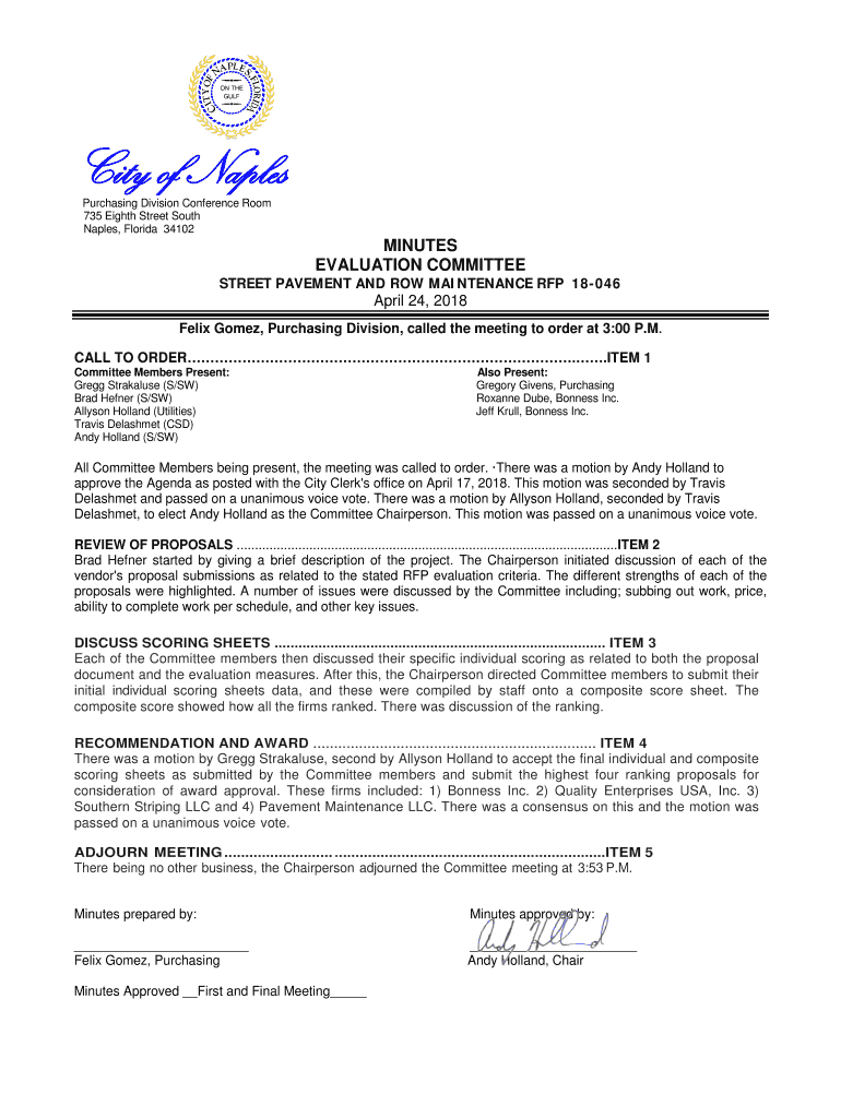 EVALUATION COMMITTEESTREET PAVEMENT AND ROW MAINTENANCE RFP 18046April 24, 2018