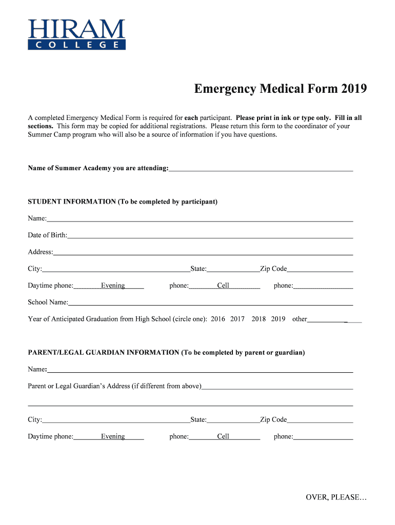 A completed Emergency Medical Form is required for each participant. Please print in ink or type only. Fill in all