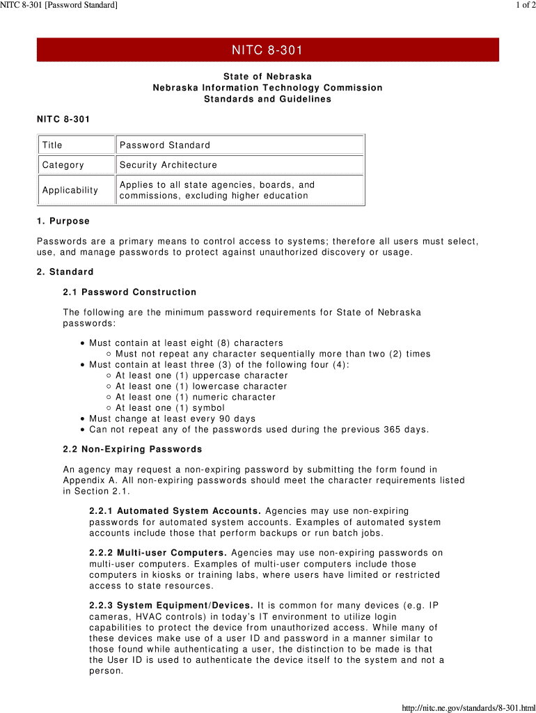 ITC 8301 Password Standard 1 of 2NITC 8301 St at e of Nebraska Inf or mat ion Technology Commission St Adar DS and Guidelines NIT C 8 301 Tit repass or d St Adar cat ego secure it y Ar chit etc your