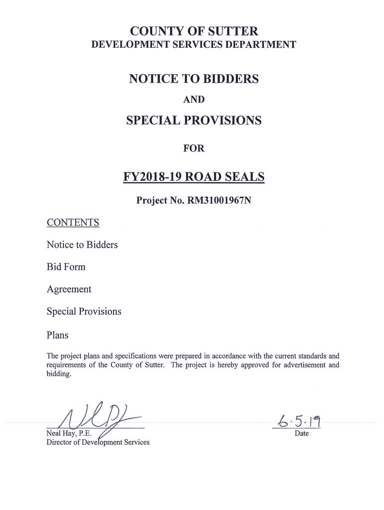 NOTICE TO BIDDERS Notice is hereby given that the County of Sutter, California, will receive sealed bids as follows: BID DATE / TIME:JULY 9, 2019, Until 10:00 A.M. (LOCAL TIME)SUBMIT BIDS TO:COUNTY