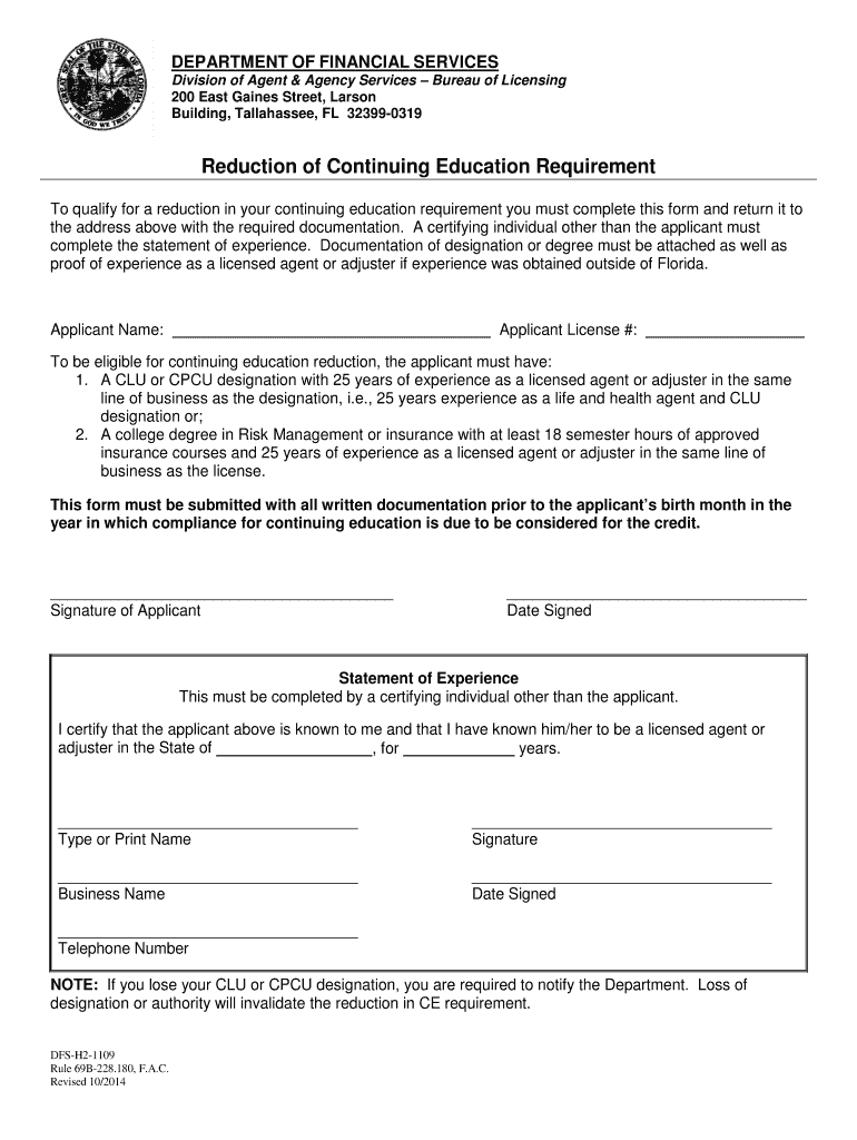 DEPARTMENT OF FINANCIAL SERVICES Division of Agent & Agency Services Bureau of Licensing 200 East Gaines Street, Larson Building, Tallahassee, FL 323990319Reduction of Continuing Education Requirement