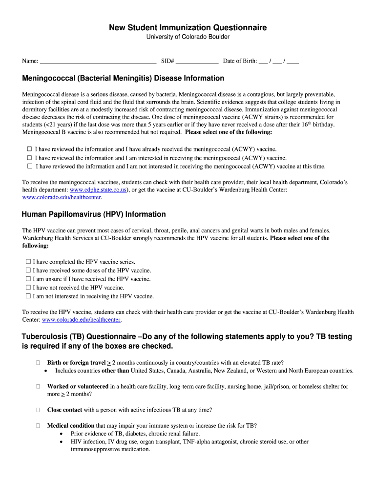 New Student Immunization Questionnaire University of Colorado BoulderName: SID# Date of Birth: / / Meningococcal (Bacterial Meningitis) Disease Information Meningococcal disease is a serious disease,
