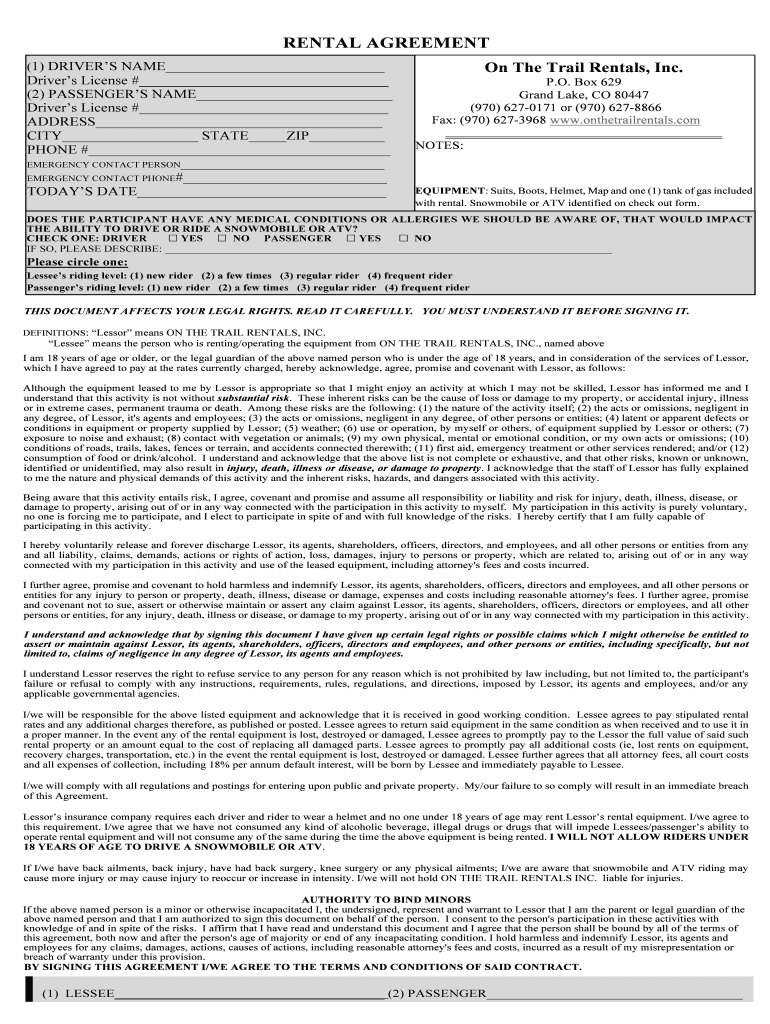 RENTAL AGREEMENT (1) DRIVERS NAME Driver's License # (2) PASSENGERS NAME Driver's License # ADDRESS CITY STATE ZIP PHONE # EMERGENCY CONTACT PERSON EMERGENCY CONTACT PHONE# TODAYS DATE On The Trail
