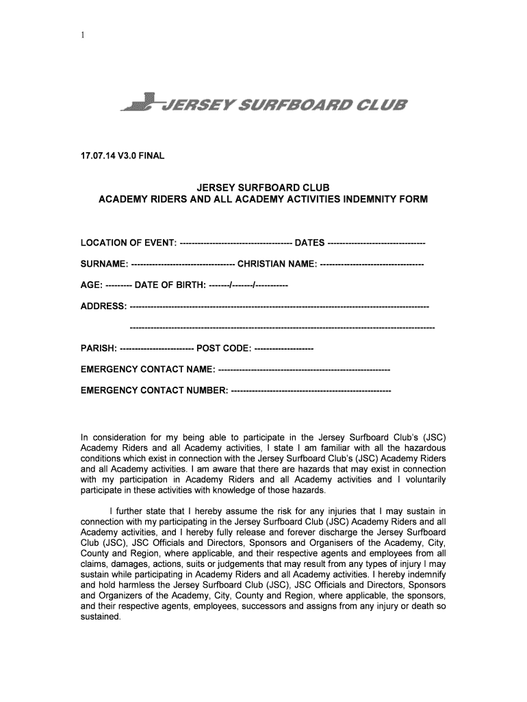 117.07.14 V3.0 FINALJERSEY SURFBOARD CLUB ACADEMY RIDERS AND ALL ACADEMY ACTIVITIES INDEMNITY FORMATION OF EVENT: DATES SURNAME: CHRISTIAN NAME: AGE: DATE OF BIRTH: //ADDRESS: