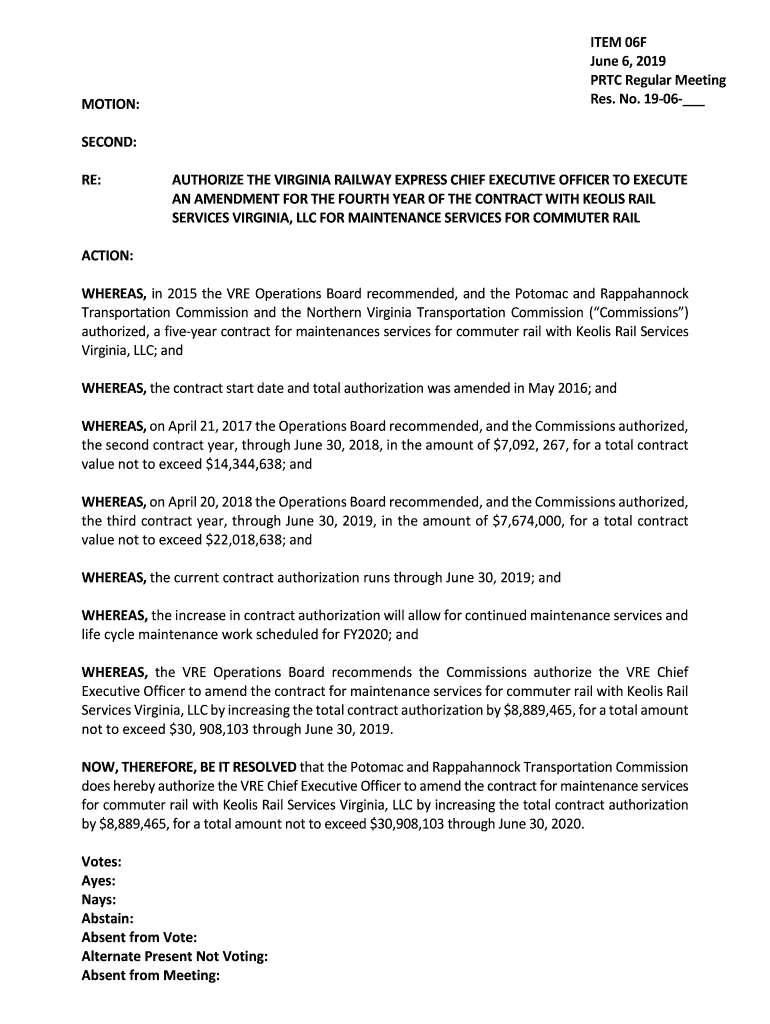 ITEM 06F June 6, 2019, PRC Regular Meeting Res. No. 1906 MOTION: SECOND: RE:AUTHORIZE THE VIRGINIA RAILWAY EXPRESS CHIEF EXECUTIVE OFFICER TO EXECUTE AN AMENDMENT FOR THE FOURTH YEAR OF THE CONTRACT