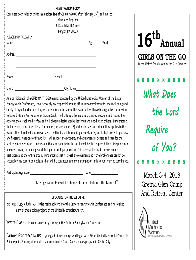 REGISTRATION FORM Complete both sides of this form, enclose fee of $60.00 ($70.00 after February 15th) and mail to: Mary Ann Reps her 164 South Ninth Street Bangor, PA 18013 PLEASE PRINT CLEARLY: