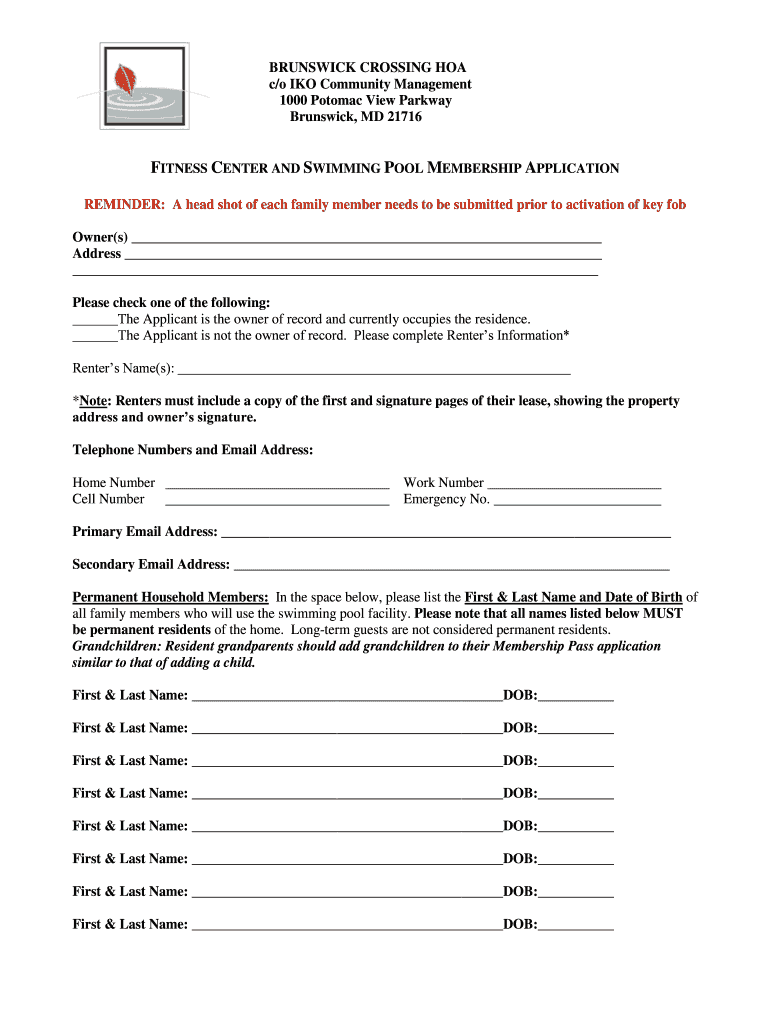 BRUNSWICK CROSSING HOA c/o IPO Community Management 1000 Potomac View Parkway Brunswick, MD 21716FITNESS CENTER AND SWIMMING POOL MEMBERSHIP APPLICATION REMINDER: A headshot of each family member
