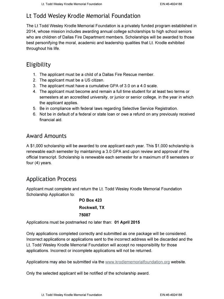 Lt. ToddWesleyKrodleMemorialFoundationEIN:464924188Lt Todd Wesley Role Memorial Foundation