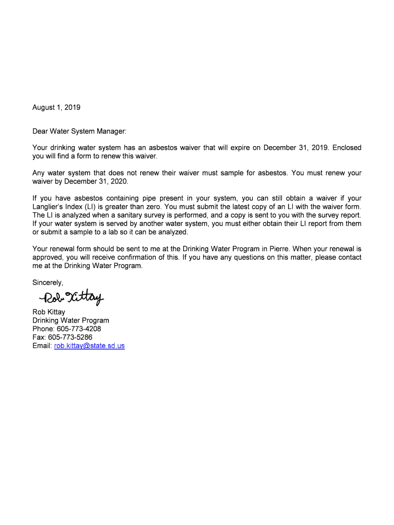 Your drinking water system has an asbestos waiver that will expire on December 31, 2019. Enclosed