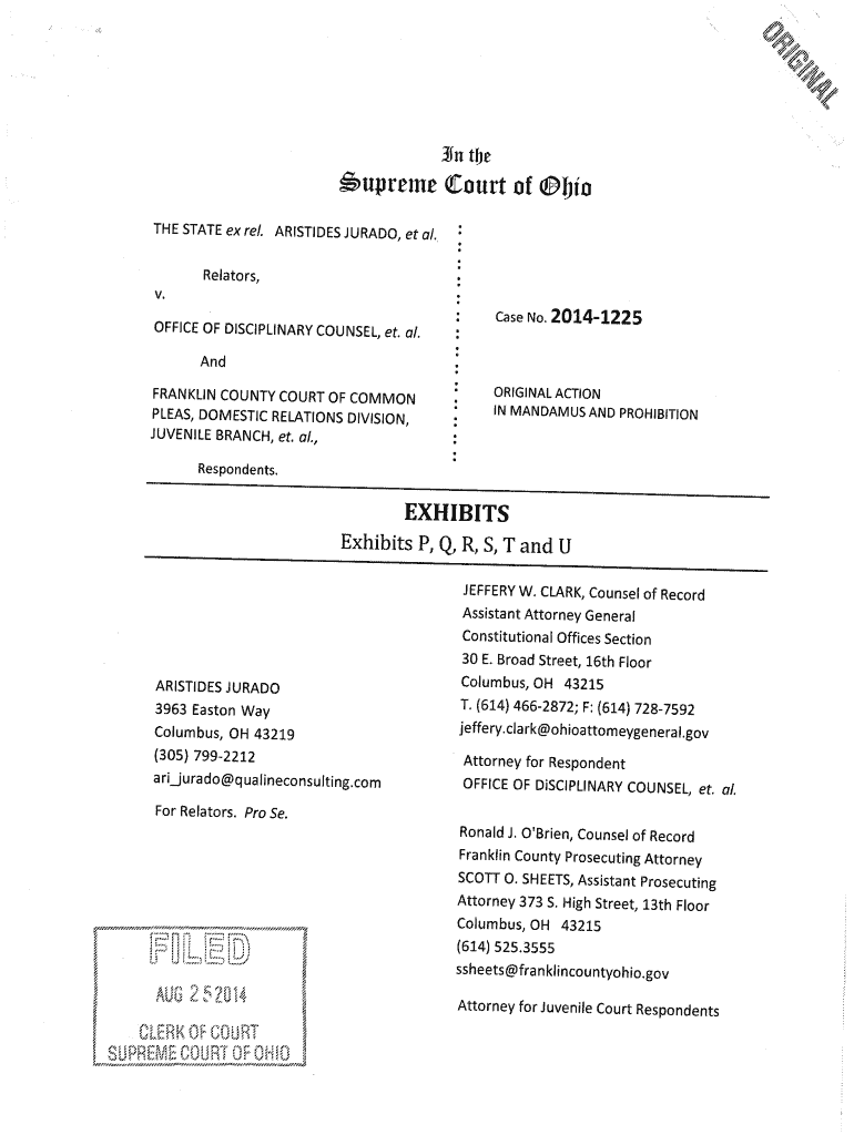. OF31n tije6uprerrYe Court of bid THE STATE ex rel. ARISTIDES JURADO, et al. Relaters, V.OFFICE OF DISCIPLINARY COUNSEL, ET. case No. 20141225And FRANKLIN COUNTY COURT OF COMMON PLEAS, DOMESTIC RELATIONS