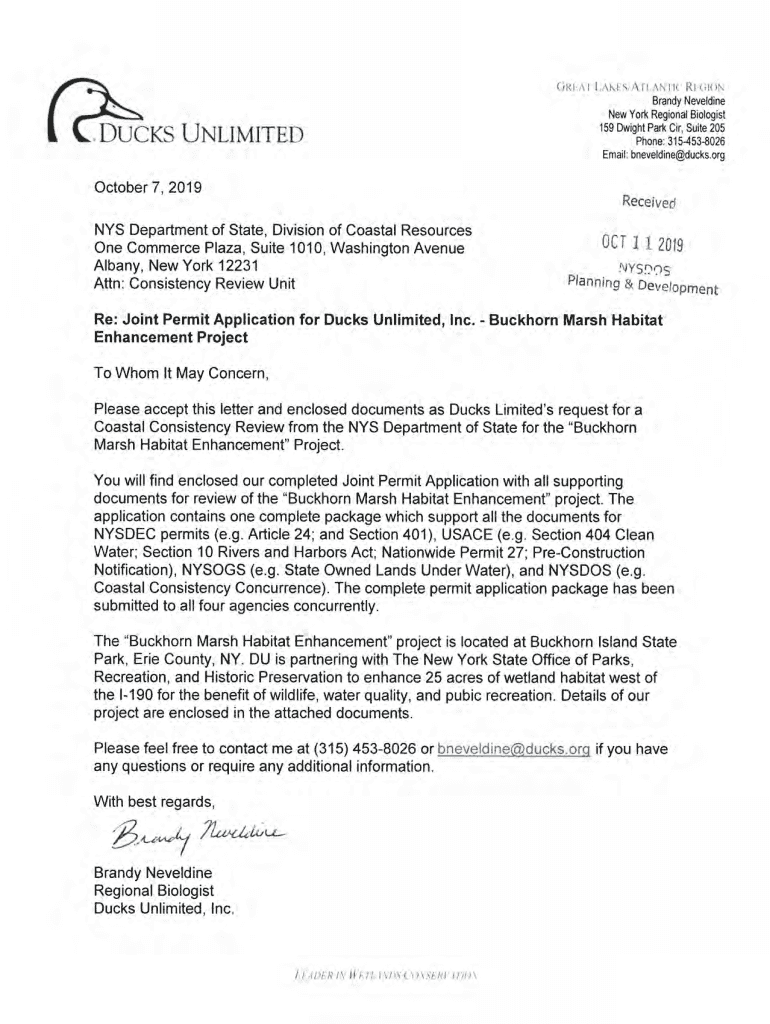 GRF.AI, AKT.is Ar LAST 'r(' RR, (Lon Brandy Eveline New York Regional Biologist 159 Dwight Park Cir, Suite 205 Phone: 3154533026.DUCKS IJNIIvIITEDEmail : beeline ducks.org October 7,2019, Received