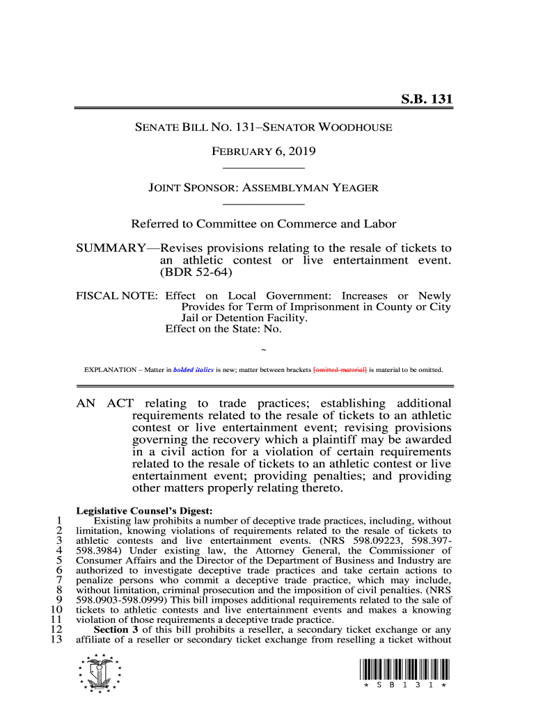S.B. 131 SENATE BILL NO. 131SENATOR WOODHOUSE FEBRUARY 6, 2019, JOINT SPONSOR: ASSEMBLYMAN YEAGER Referred to Committee on Commerce and Labor SUMMARYRevises provisions relating to the resale of tickets