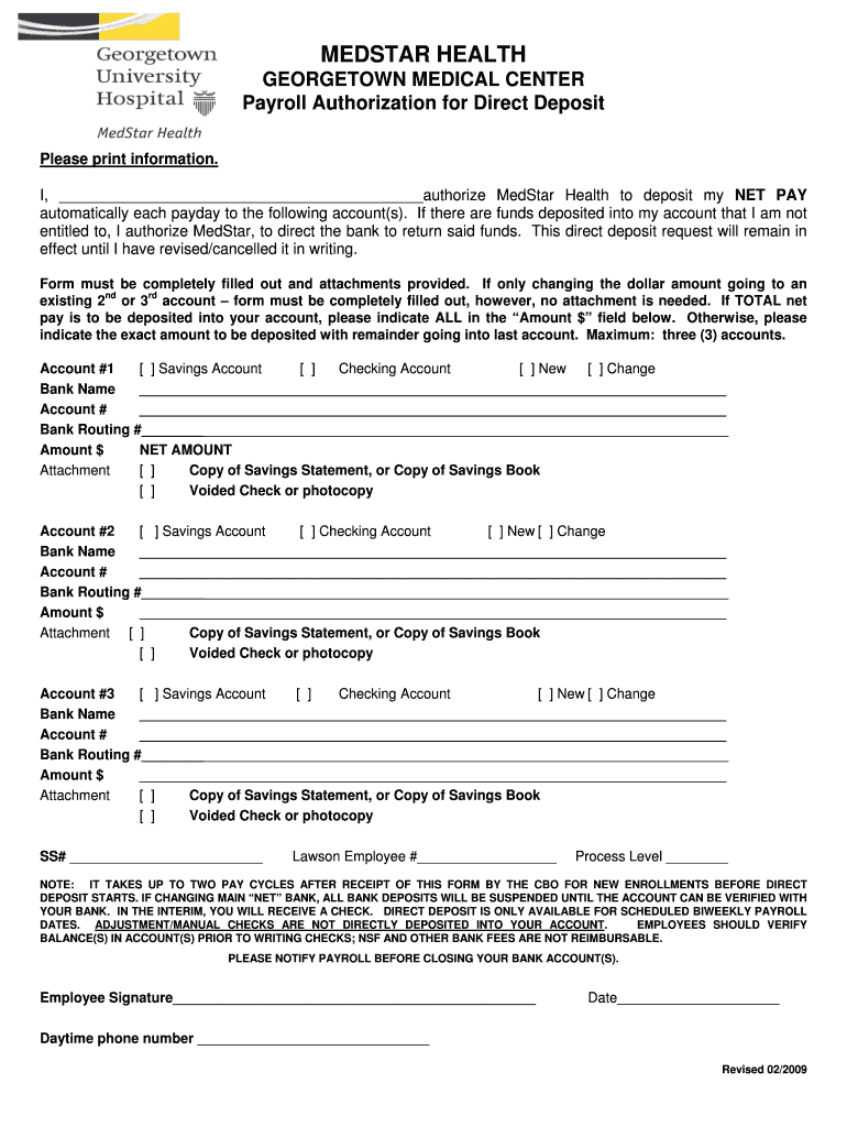 MED STAR HEALTH GEORGETOWN MEDICAL CENTER Payroll Authorization for Direct Deposit Please print information. I, authorize Megastar Health to deposit my NET PAY automatically each payday to the following