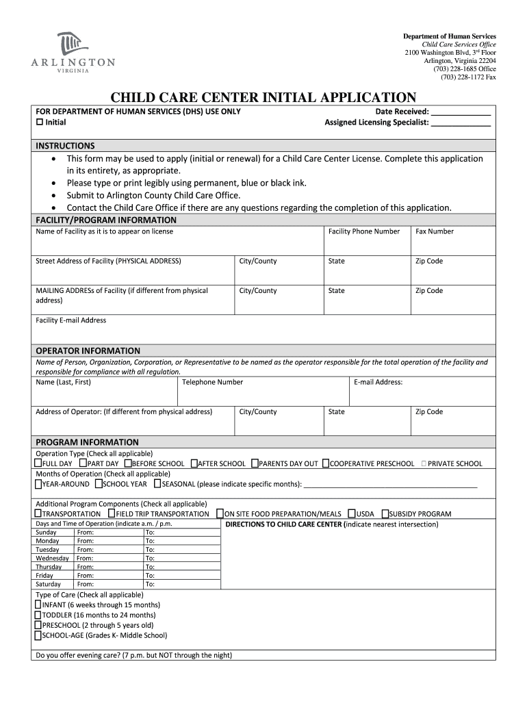 Department of Human Services Child Care Services Office 2100 Washington Blvd, 3rd Floor Arlington, Virginia 22204 (703) 2281685 Office (703) 2281172 Child CARE CENTER INITIAL APPLICATION FOR DEPARTMENT