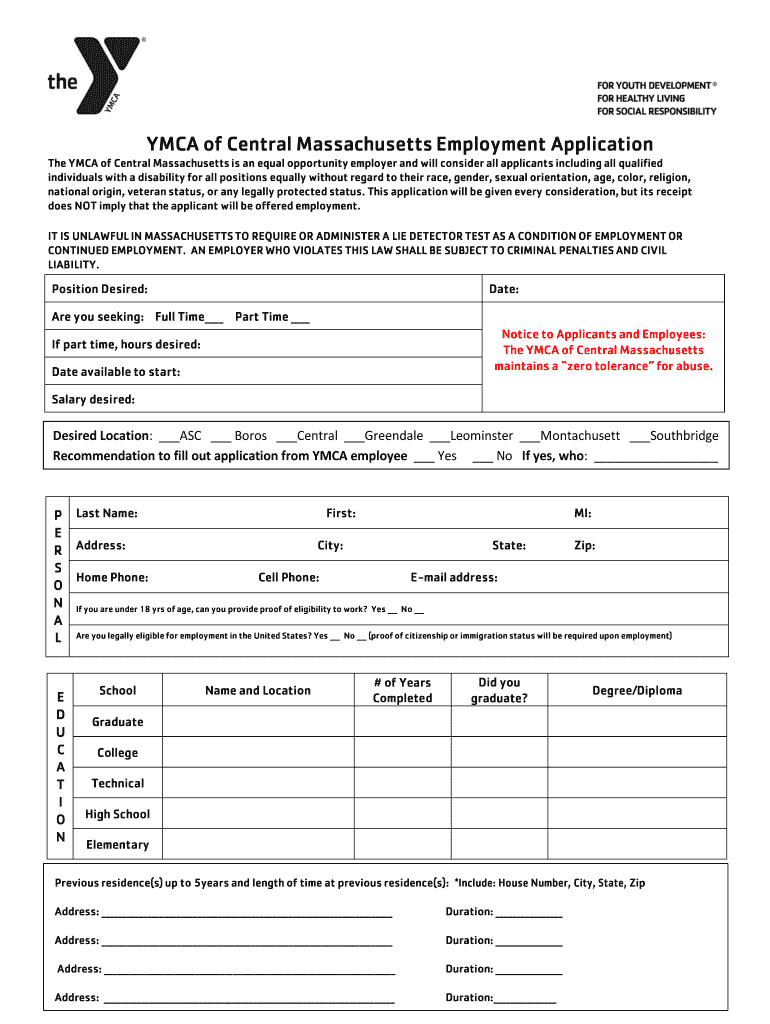 Get the free YMCA of Central Massachusetts Employment Application