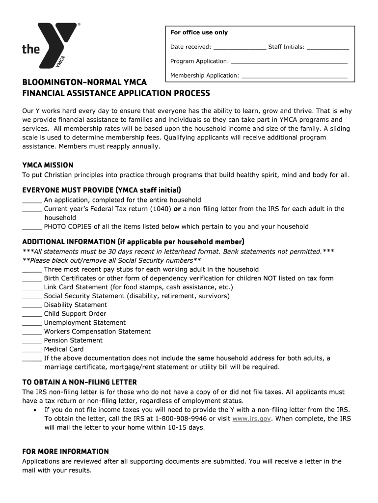For office use only Date received: Staff Initials: Program Application: Membership Application: BLOOMINGTONNORMAL YMCA FINANCIAL ASSISTANCE APPLICATION Processor Y works hard every day to ensure that