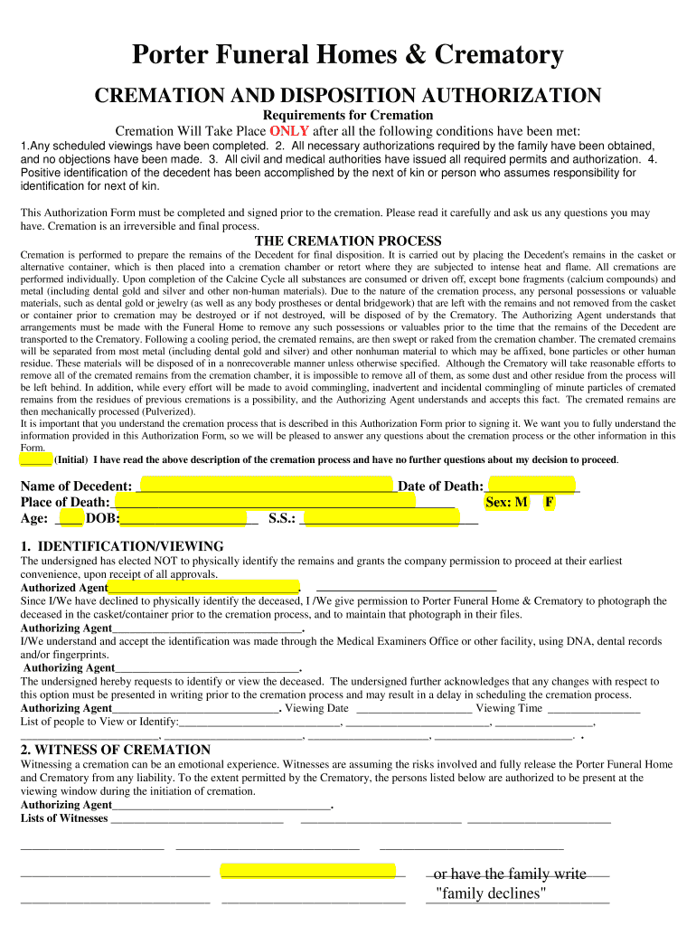 Porter Funeral Homes & Crematory CREMATION AND DISPOSITION AUTHORIZATION Requirements for Cremation Will Take Place ONLY after all the following conditions have been met: 1. Any scheduled viewings
