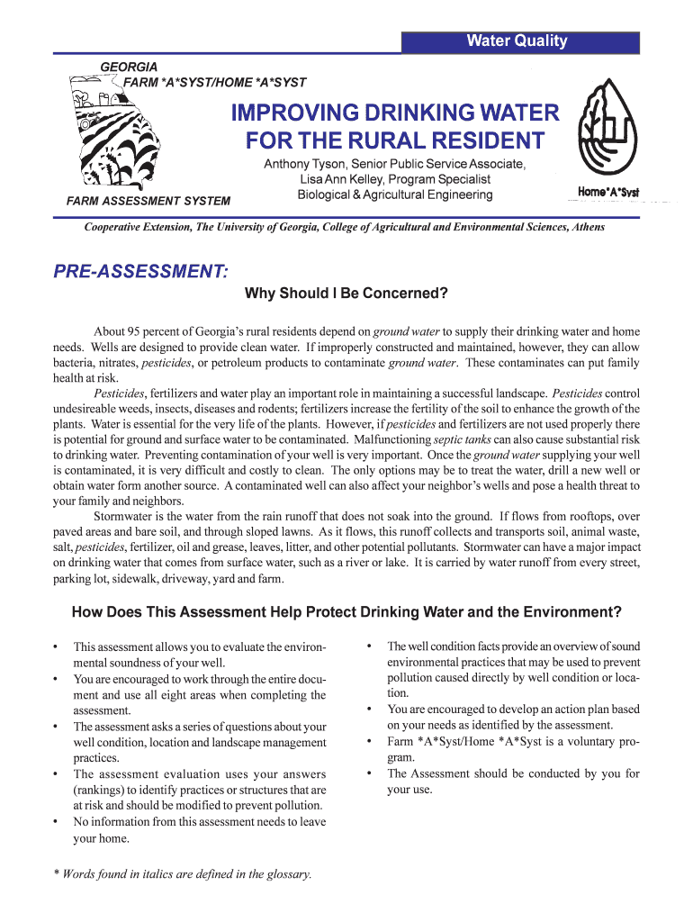 Water Quality Animal ProductionGEORGIA FARM *A×SST/HOME *A×SYSTIMPROVING DRINKING WATER FOR THE RURAL RESIDENT FARM ASSESSMENT SYSTEM Anthony Tyson, Senior Public Service Associate, Lisa Ann Kelley,